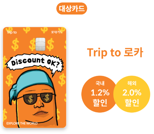 [롯데카드 Trip to 로카 빠니보틀 카드]를 해외 롯데카드 가맹점에서 사용시 2.0% 결제일 할인 혜택이 제공 됩니다.
